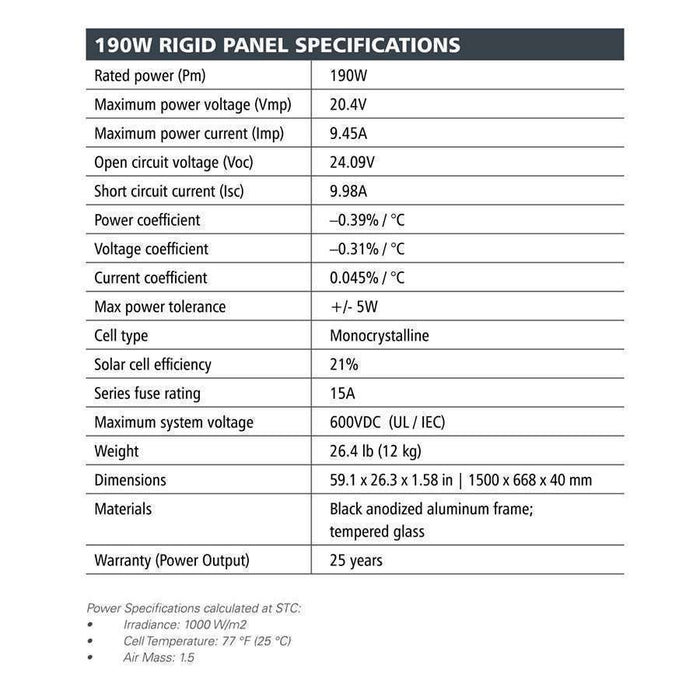 Rigid, black-framed 190 watt, 9.45 amp solar module