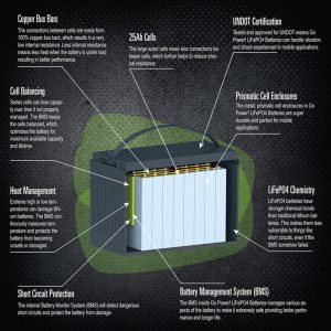 Go Power! LiFePO4 Lithium batteries feature several safety components in the BMS, which Include: