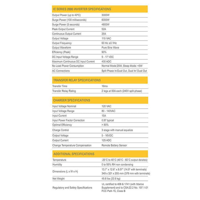 The two 50 amp legs set its performance apart from common 50 amp inverter chargers. The configuration allows users to make full use of a 100 amp shore power service (240V) by passing through up to 12,000 watts of power! It is also compatible with all 30 amp services.