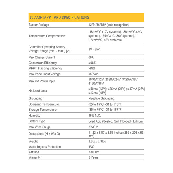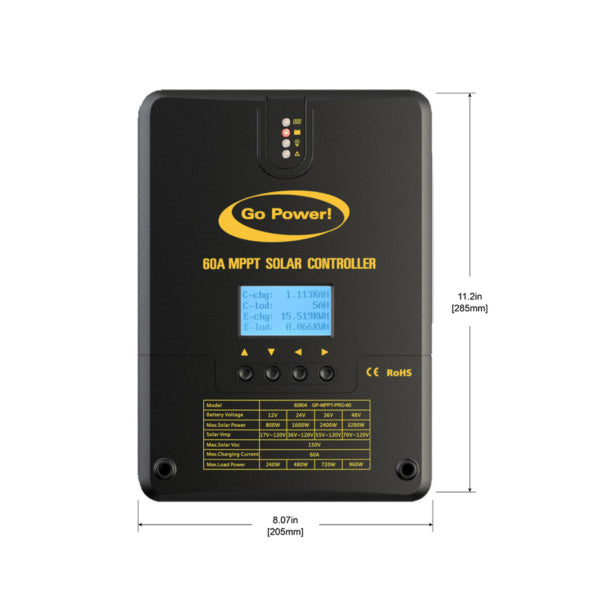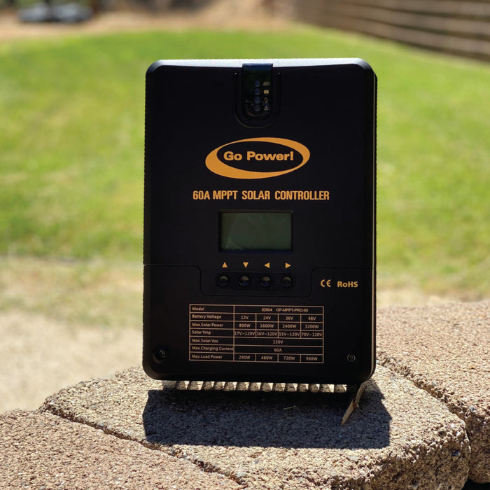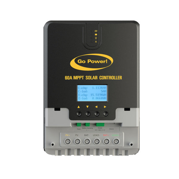 Go Power!’s largest solar controller. This 60 Amp MPPT Solar Controller uses Maximum Power Point Tracking (MPPT) charging with up to 98% efficiency.