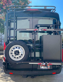 Introducing the versatile Aluminess Rear Door Bike Rack for the Ford Transit. Are your bikes taking up room in your van? The new Aluminess bike rack solves this problem! We have several configurations available to mount your bikes. Our system can accommodate vertically mounted bikes or if you need additional storage, we offer a kit where you can mount one of our solid storage boxes in addition to two bikes. For the ultimate in storage and versatility get a matching driver side rack to mount a spare tire or storage box.