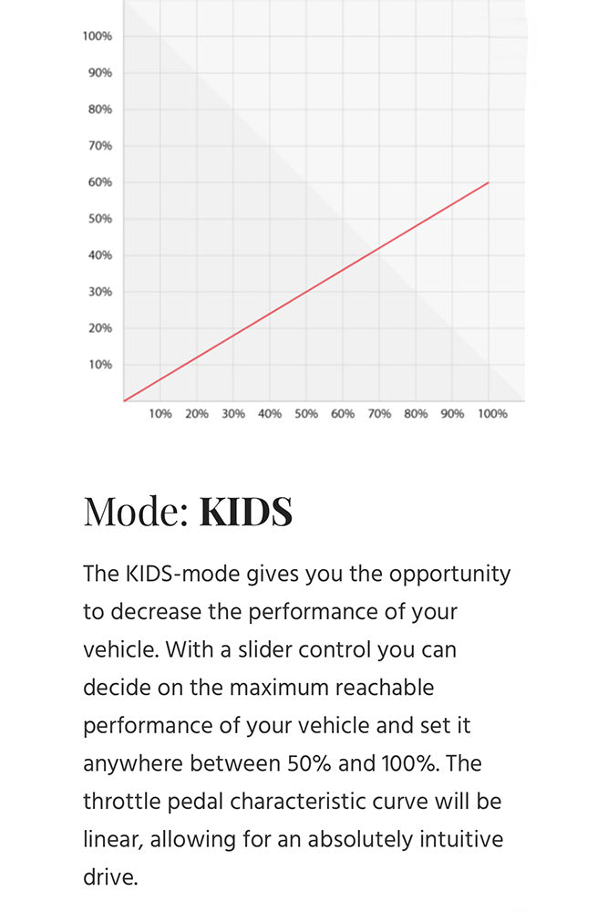 KIDS – allows you to limit the overall performance by up to 50% and produces a linear throttle curve.
