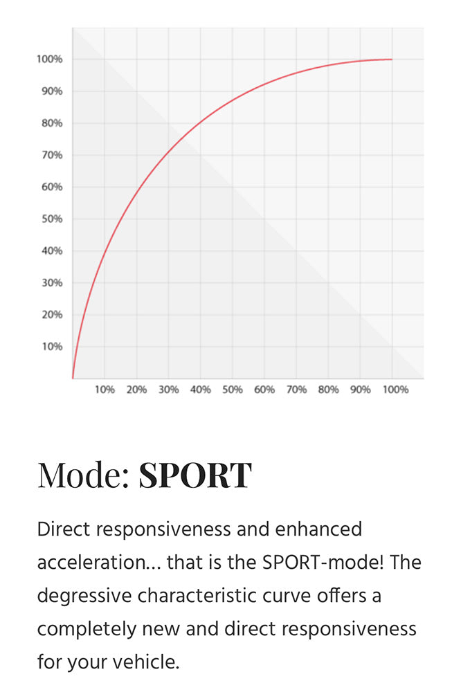 SPORT – offers aggressive throttle characteristics with snappy response at the lower range of input.