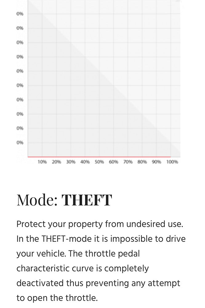 THEFT – completely disables the throttle pedal via the Bluetooth app.