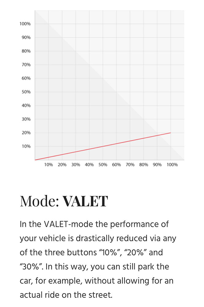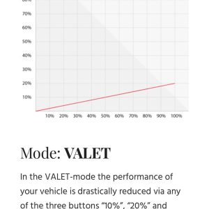 VALET – drastically reduces pedal output to limit vehicle performance and speed, to 10, 20 or 30% of the maximum.